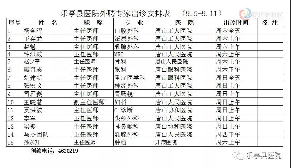 乐亭县医院9月5日-11日外聘专家出诊安排